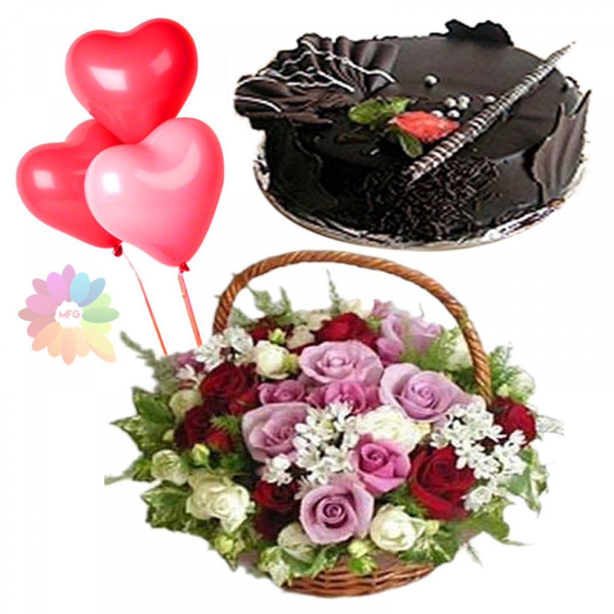 Birthday GIFts 2Basket of 24 mix colour roses with 1 pound chocolate fantasy cake with 3 heart shape balloons