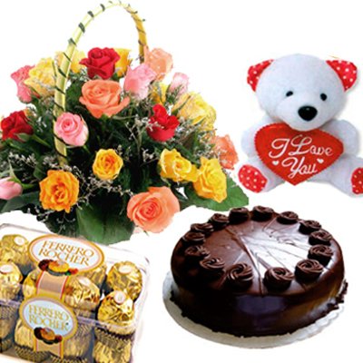 Romantic Choco Love24 Multi Colour Roses Basket with 200 g ferrero Chocolates and 8 "Cuddly Bear. chocolates cake. i love you pillow Tell your friends / loved ones to gift you this