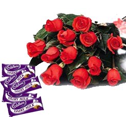 Flowers N ChocolatesBunch of 12 Red Roses with 5 Cad-bury milk Chocolates.(40 grm each).