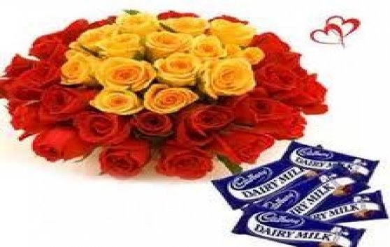 Sweet of youV Day- Bouquet of 36 Red and Yellow Roses with 6 Diary Milk Chocolates, 65 g each