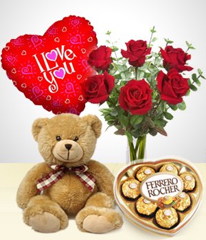 Valentines Silver ComboWe have the perfect gift for Valentines..... Includes: - 6 rose in a vase - A teddy bear 24 inchses - I love you balloon - A chocolate heart shaped box