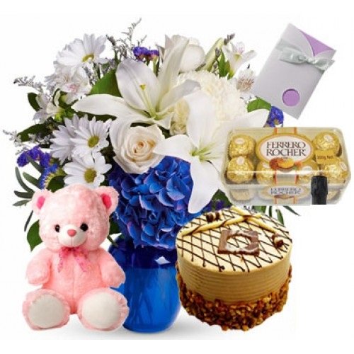 You Are My Everything8'' Pink or Brown Or White Teddy BearWine 16pcs. Ferrero Rocher Chocolate Greeting Card Black Forest Cake OR Mango CAke white malaysian,12 white roses,1 stick white stargazer ,white alstromeria purple statice and blue hydrangea in a Vase.