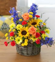 Flowers basket-2Beautifully arranged sunflowers,seasonal flower,red roses in a basket - long lasting beauty!