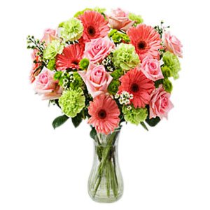 Pretty In pink luvDescription Make her laugh! A deliciously sweet gift, reminiscent of childhood- candies and lollipops. Send her one dozen pink roses, gerberra daisies, green carnations, and mint green buttons, a sweet way to share your thoughts. Dozen Pink Roses, Gerberra Daisies, Green Carnations, And Mint Green Buttons