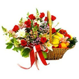 Especially For You...MOmOranges, apples and bananas complete this basket of flowers with the juicy, citrus sweetness they bring out. Fruits Arrangement (6 item) & 6 red roses and stargaizer in a basket.