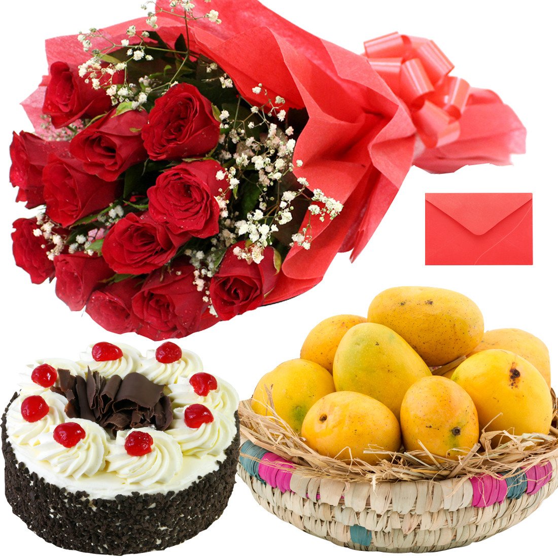 On The RangeDescription:Fruits Arrangement ( 10 mango) 12 red roses black forest N0TE: FRUITS ITEMS MAY VARY ..DEPEND ON TH AVAILABILITY