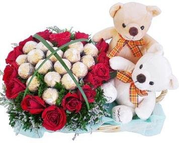 couple w/flowers & chocolatescouple w/24 red roses & 16 ferrero chocolates