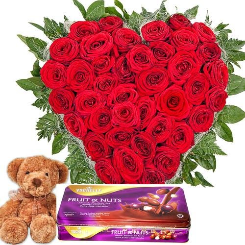 Queen of Hearts36 red roses in a heart basket with 8 inches teddy and a vochelle chocolate box