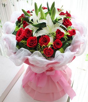 Enjoying Your LifeSelected 19 stems red roses and 2 stalks white perfume lilies, small floral decorated. White gauze, pink crepe paper round style hand bouquet, bowknot tied the end.