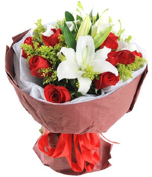 Feeling For YouMixed 11 red roses and 2 stalks white perfume lilies, with solidago. Crepe paper wrapped bouquet for love and more.