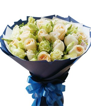 I Miss You19 champagne rose bouquet for love, with solidago, eustoma grandiflorum(decorated flower may replace to white rose for some areas). White paper inside, blue paper outside round style bouquet.