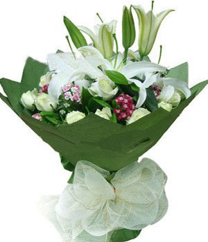 The Happy Union16 white roses, 2 stalks white perfume lilies with small floral such as gypsophila, forget-me-not. White gauze wrapped.