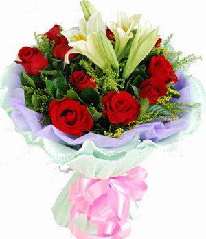 The Most Beautiful11 premium red roses, 1 stalk easter lily and match foliages and small flowers. Lilac colour cotton paper and green crepe paper round packed. Please note may substitute easter lily for white lily depending upon availability in certain regions.