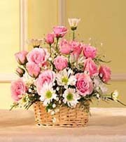 Pink BasketBasket arrangement with 12 pink roses, pink mini carnations, and hot pink carnations is complemented by some white seasonal flower. Designed in a handled basket.
